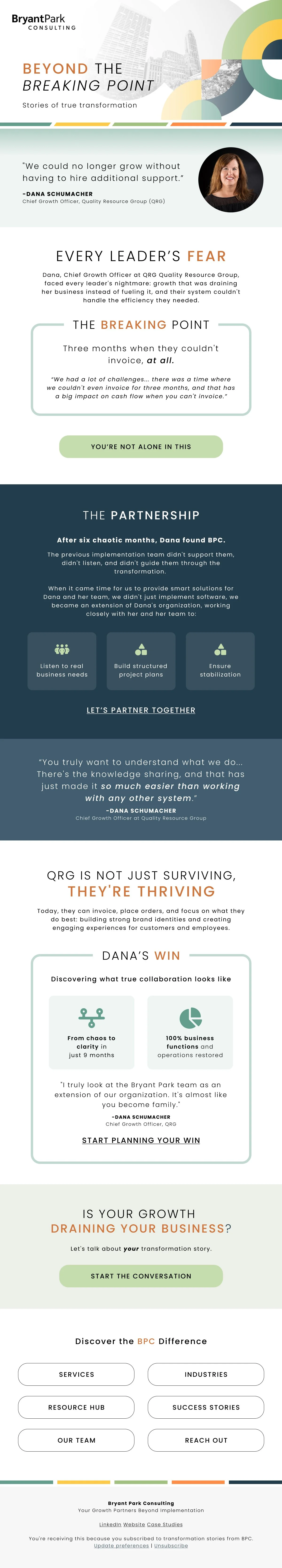 Multi-Channel Storytelling – I designed their content to work like a good conversation that picks up where you left off. Someone might discover BPC on LinkedIn, dig deeper on their website, then get nurture emails that actually feel relevant to their specific situation. No more random marketing that feels like shouting into the void.