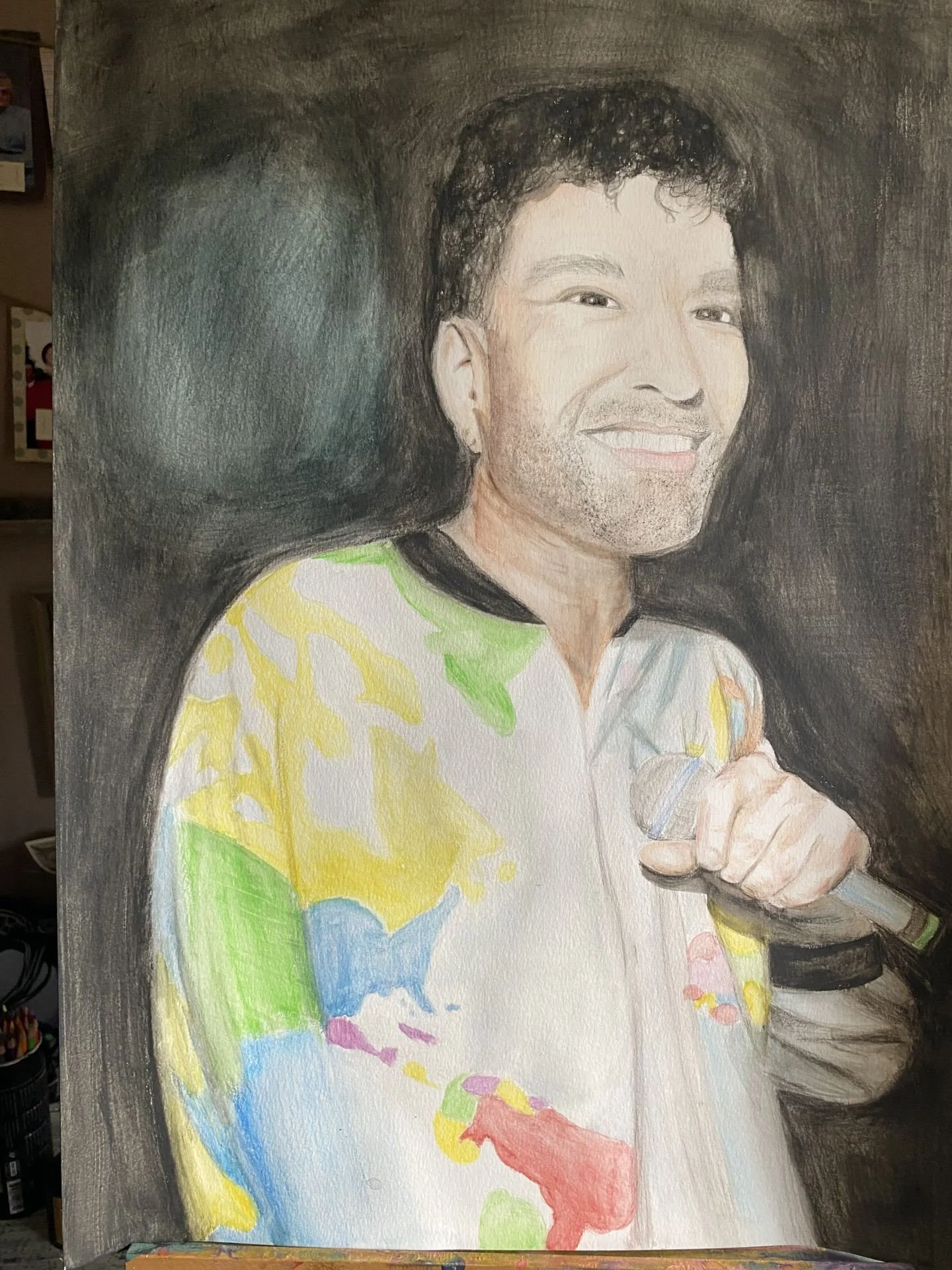 While I normally lean into graphite pencil or charcoal as my go-to medium, I was eager to explore my abilities further with watercolor pencil, especially after finding an image of my subject, Lyrics Born, in a very colorful jacket that depicted a world map.